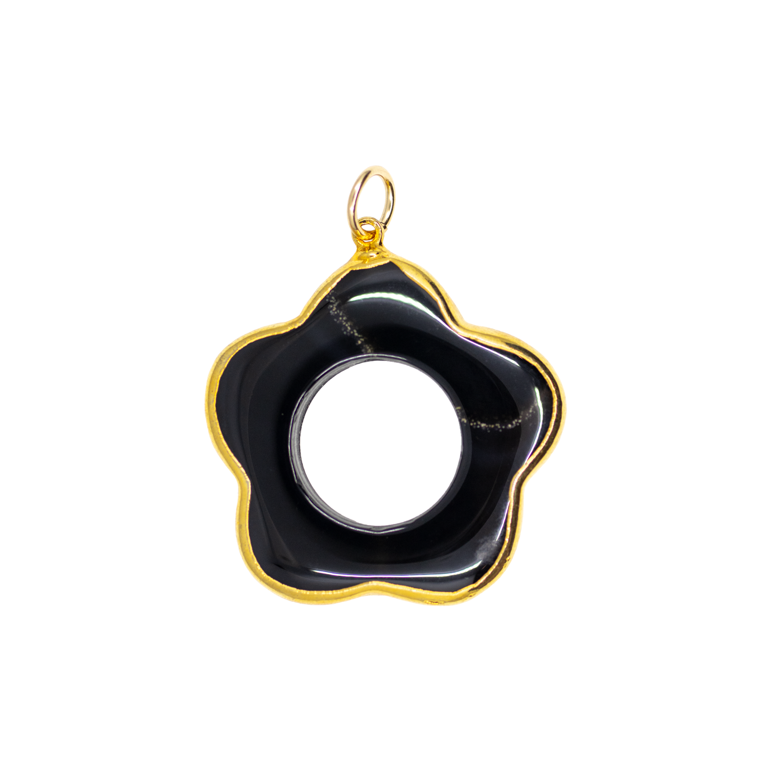 Everyone loves the shape and boldness of this brand new scalloped open flower charm. Made of black onyx and 24k gold overlay.