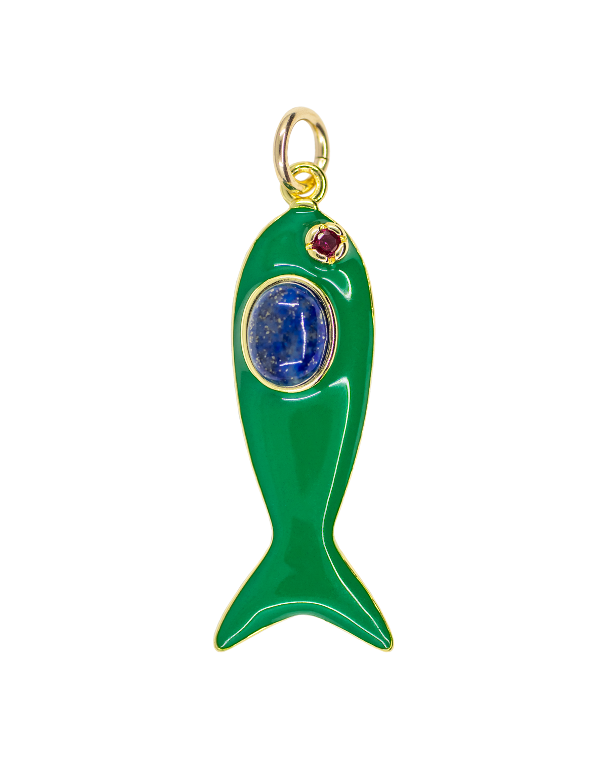 This green enamel fish charm (with inlaid lapis and garnet) is already a fan favorite! Easy to wear alone or with other charms.