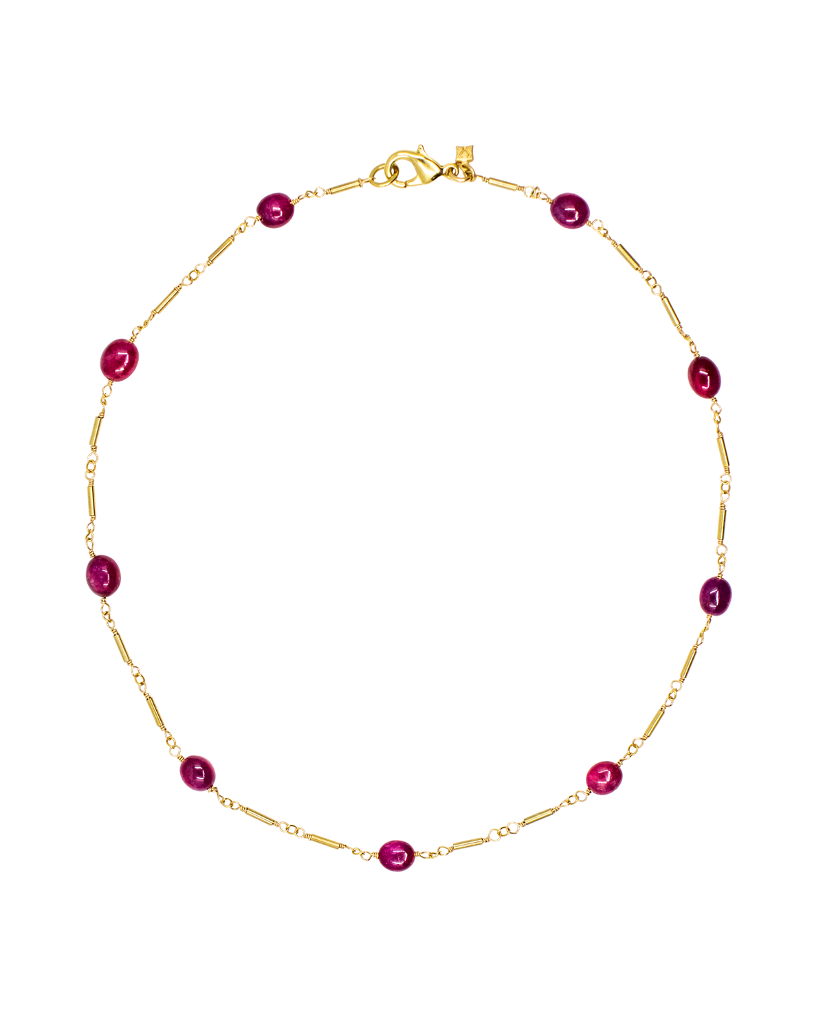 Smooth oval ruby stones with hand-linked gold-filled bars in between. 17″