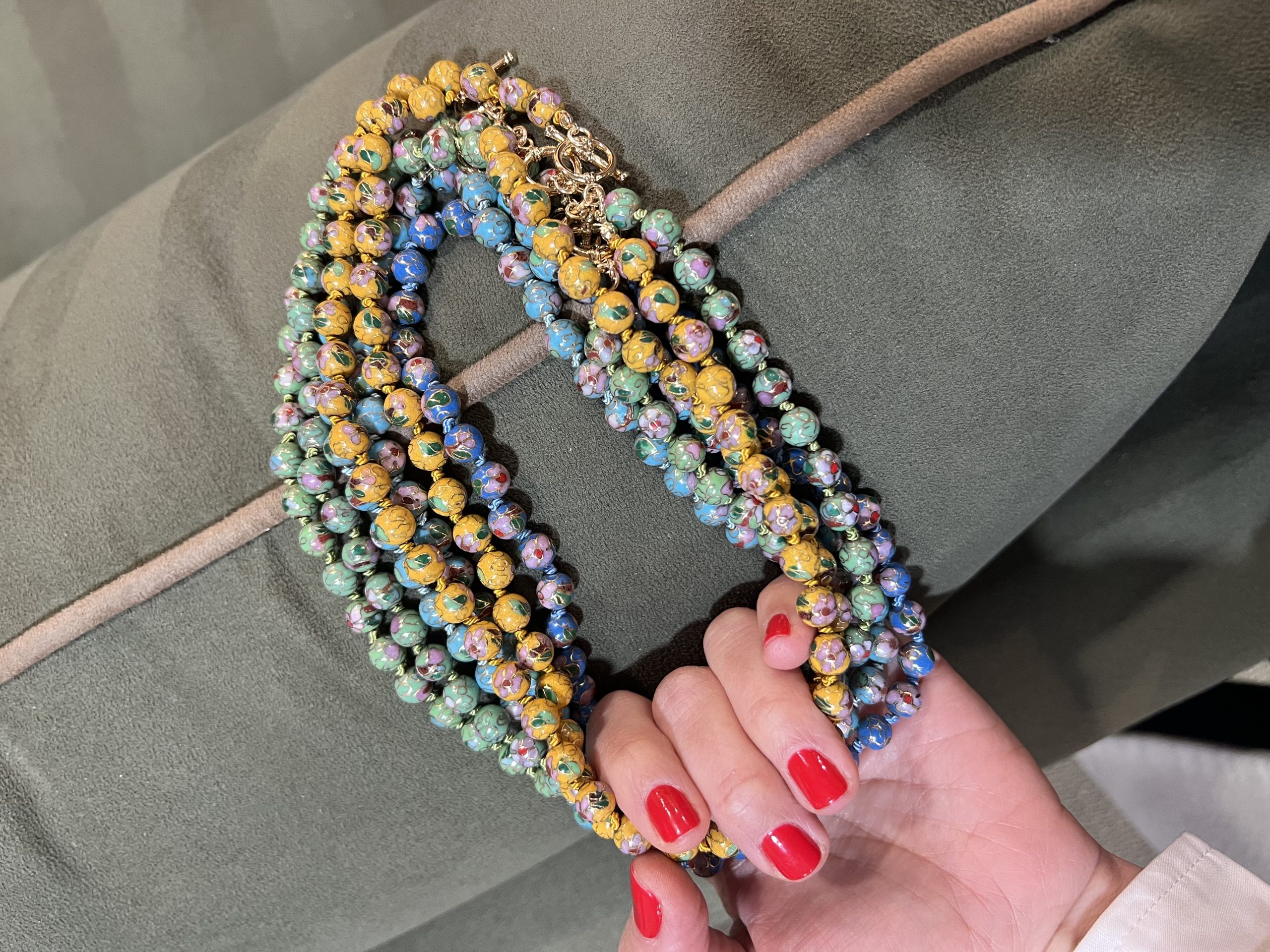 This fun and classic new cloisonne necklace is made of 8MM round beads knotted on silk. Standard length is 17″ but we can hand make any length upon request.